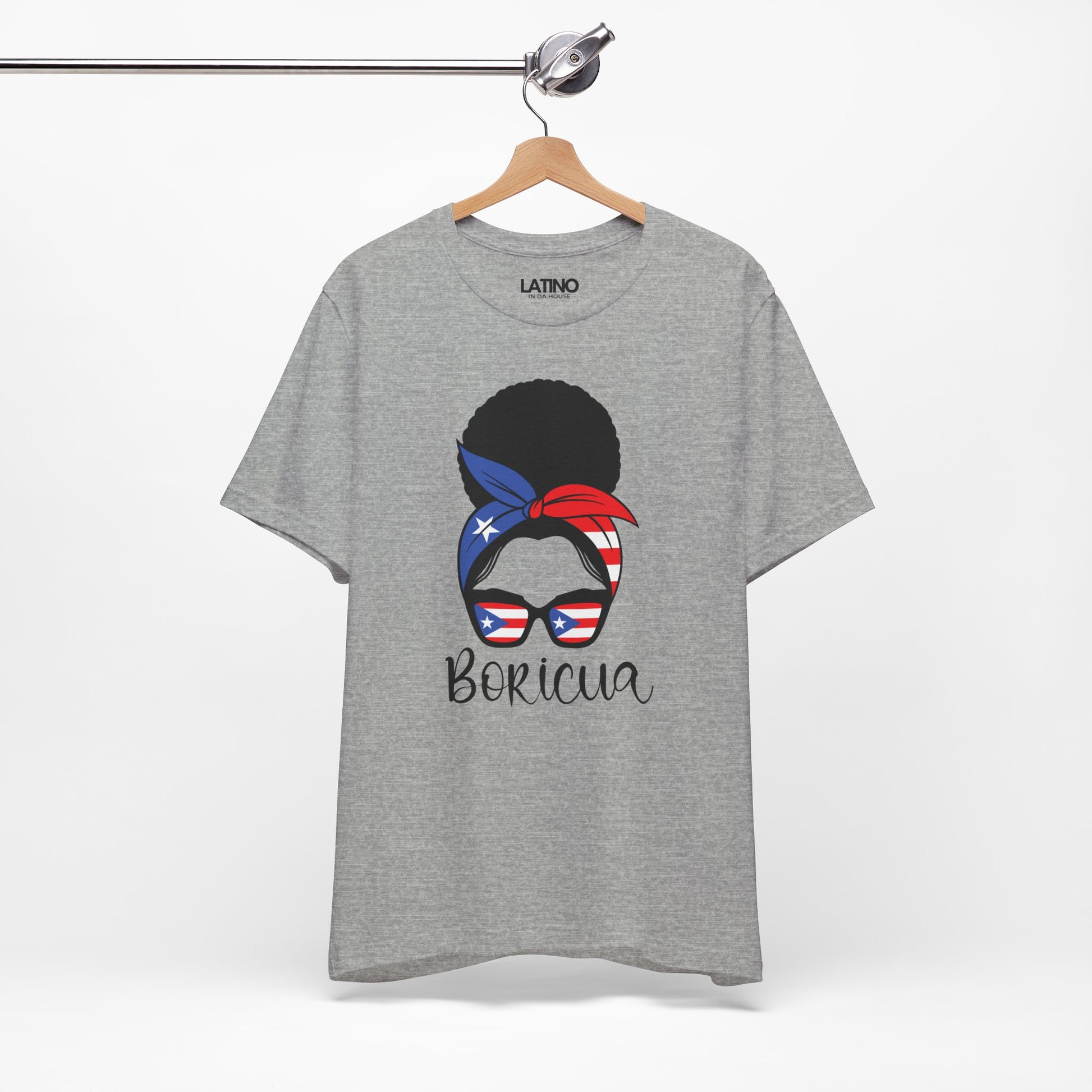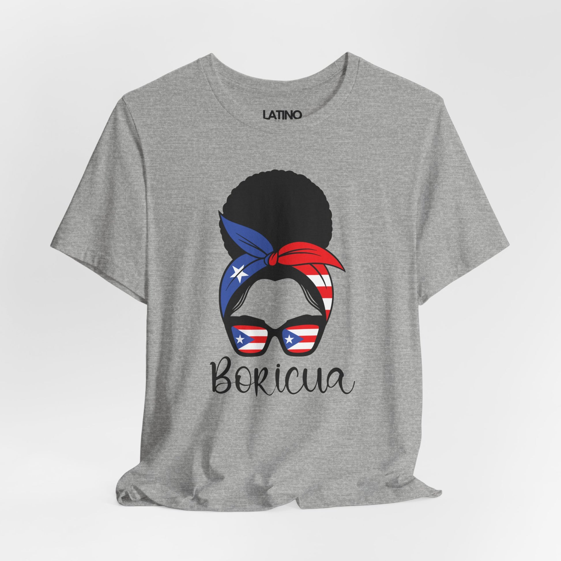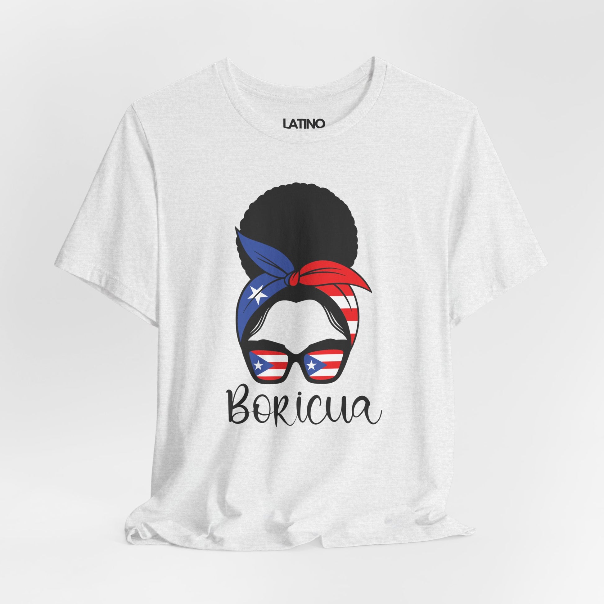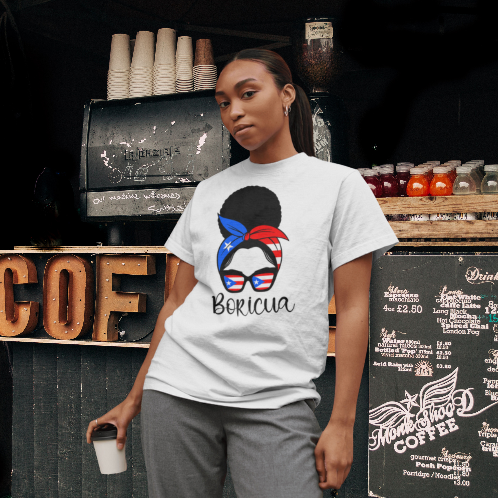 - Design: High-resolution print featuring a woman with a natural afro hairstyle, wearing Puerto Rican flag-themed sunglasses and bandana, and the word "Boricua" in elegant script