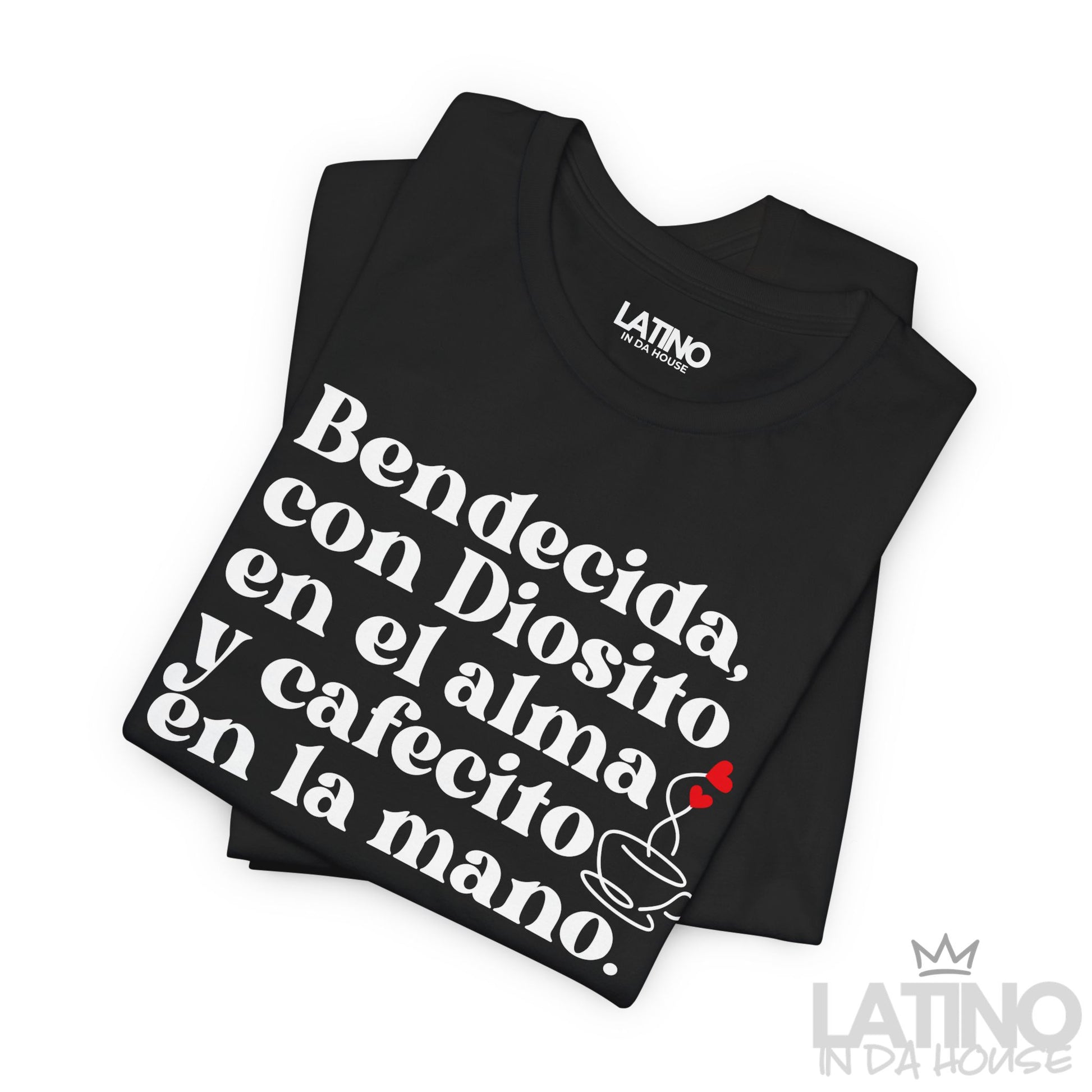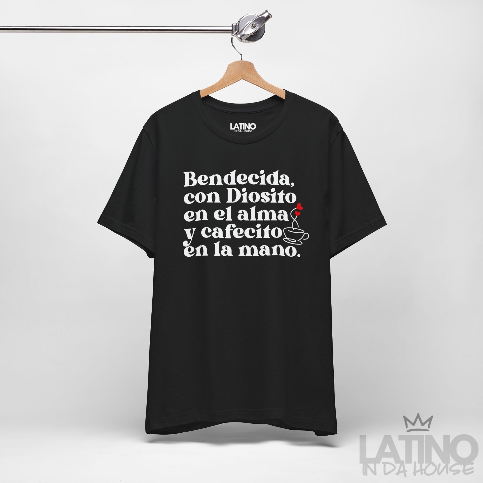 Bendecida con Diosito y Cafecito T-Shirt - Start your day blessed — with faith in your heart and cafecito in hand.