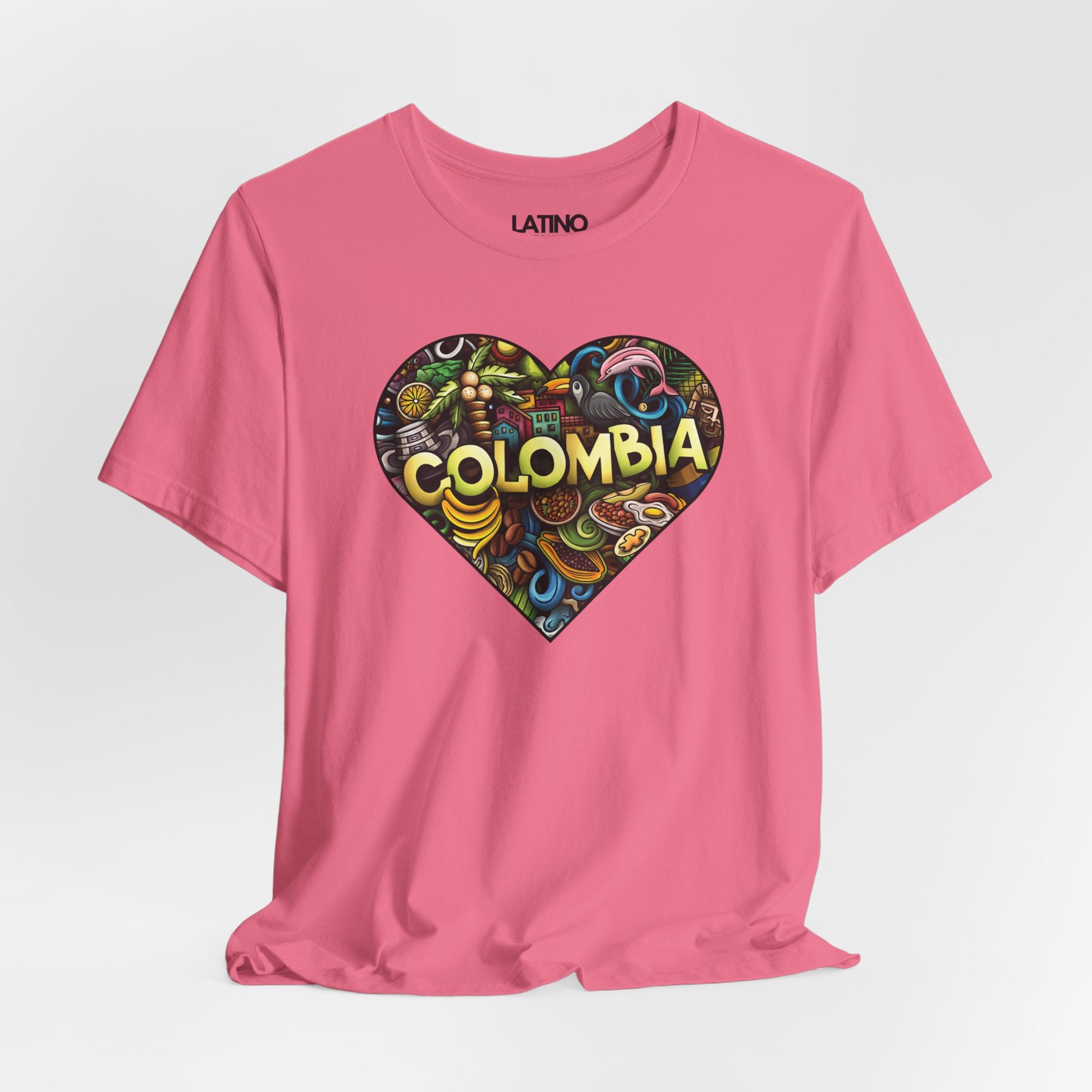 Celebrate Colombia's vibrant culture with this unisex T-shirt featuring a heart-shaped design filled with iconic symbols of Colombian heritage. The detailed graphic includes elements like coffee beans, bananas, tropical birds, palm trees, and traditional dishes, all centered around the word "Colombia." Made from 100% soft and breathable cotton, this T-shirt combines style and comfort for everyday wear.