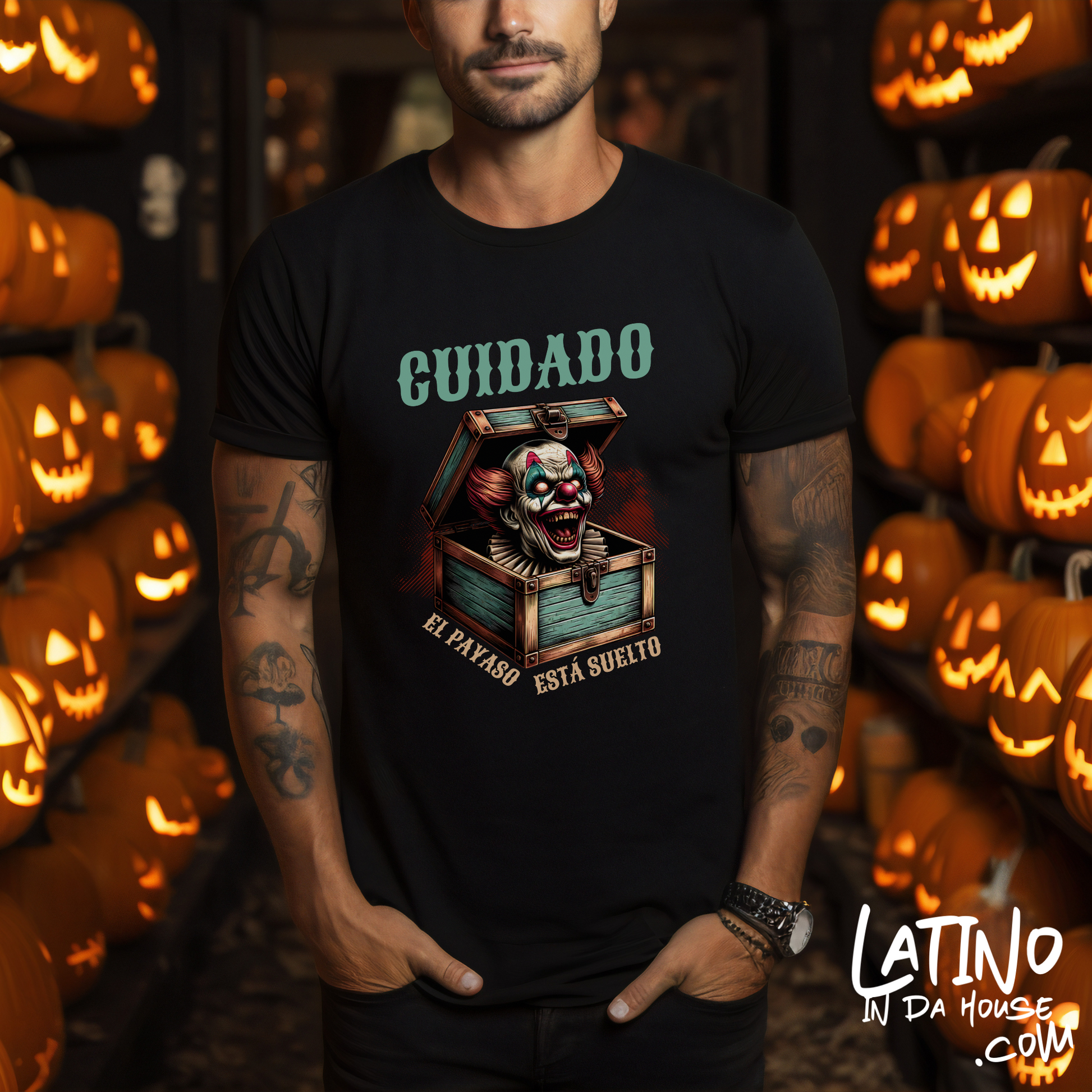 - Spanish text “Cuidado El Payaso Está Suelto” for a unique, bilingual touch
