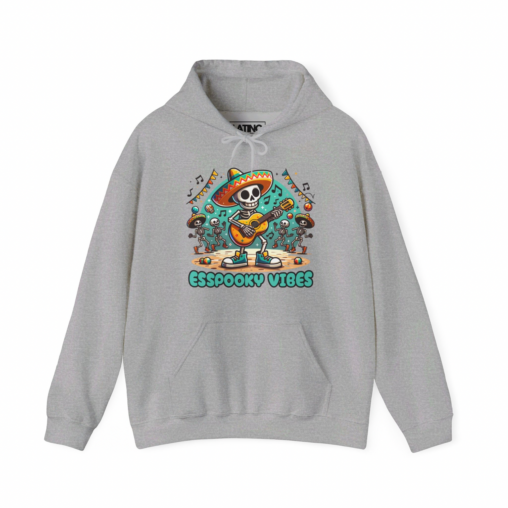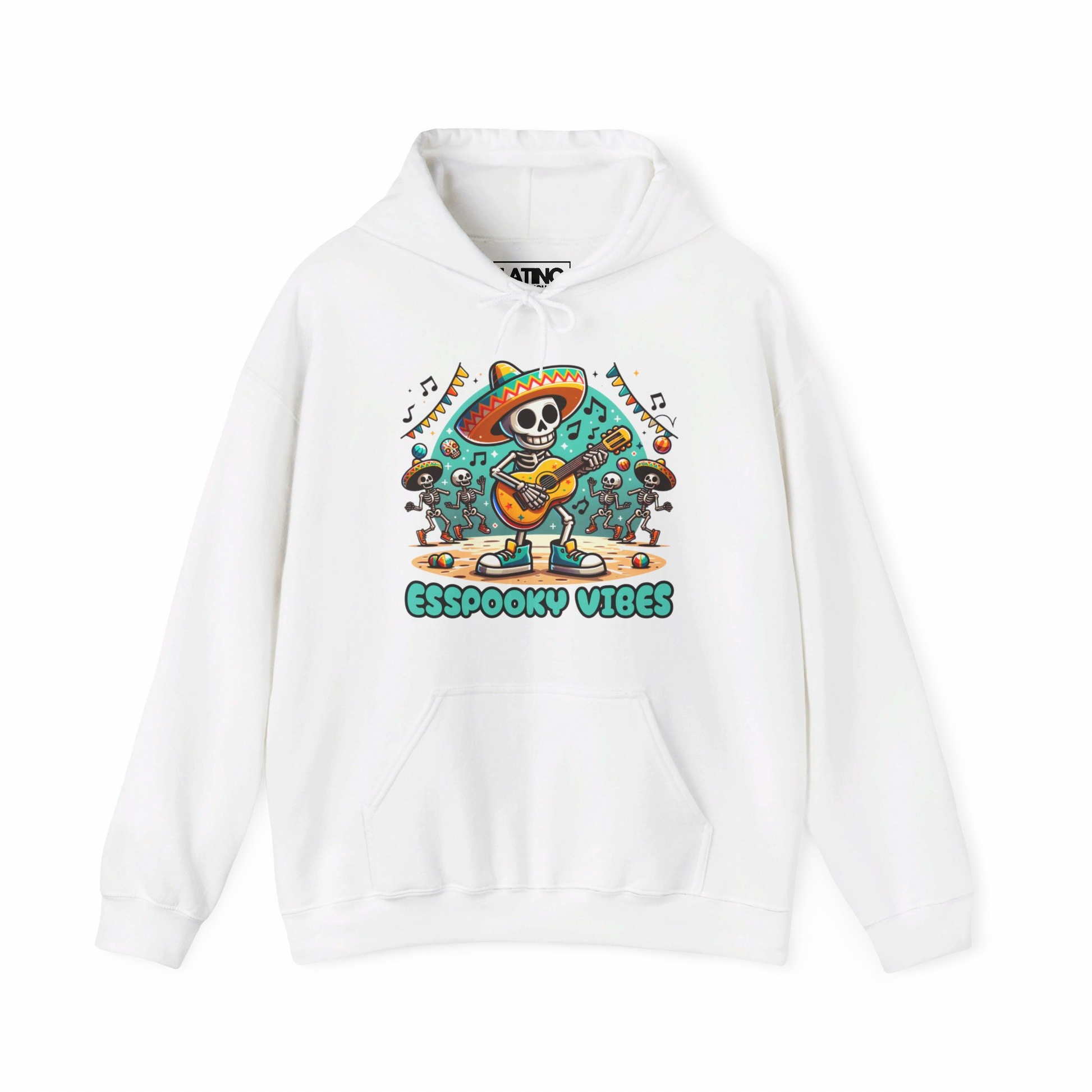 Get into the festive spirit with our "Esspooky Vibes" Skeleton Hoodie, perfect for those who love to celebrate with a touch of humor and style. This vibrant design features a lively skeleton mariachi band, complete with sombreros, guitars, and dancing skeletons, set against a backdrop of music notes and festive decorations. The playful "Esspooky Vibes" text adds a fun twist, making this hoodie the ultimate go-to for Halloween and Día de los Muertos celebrations.