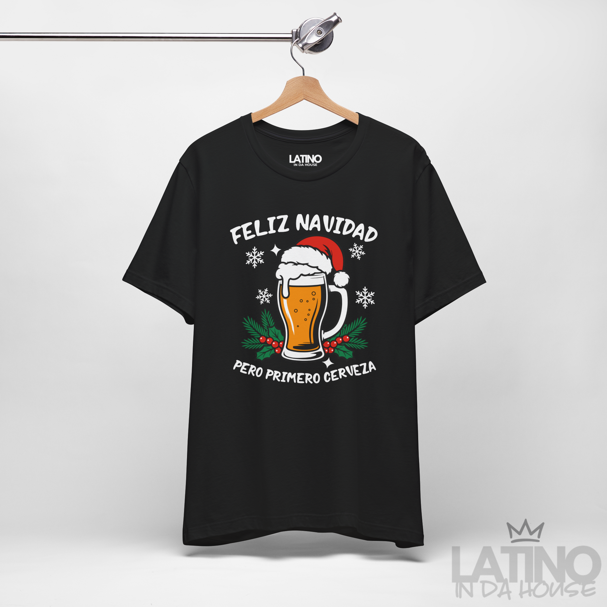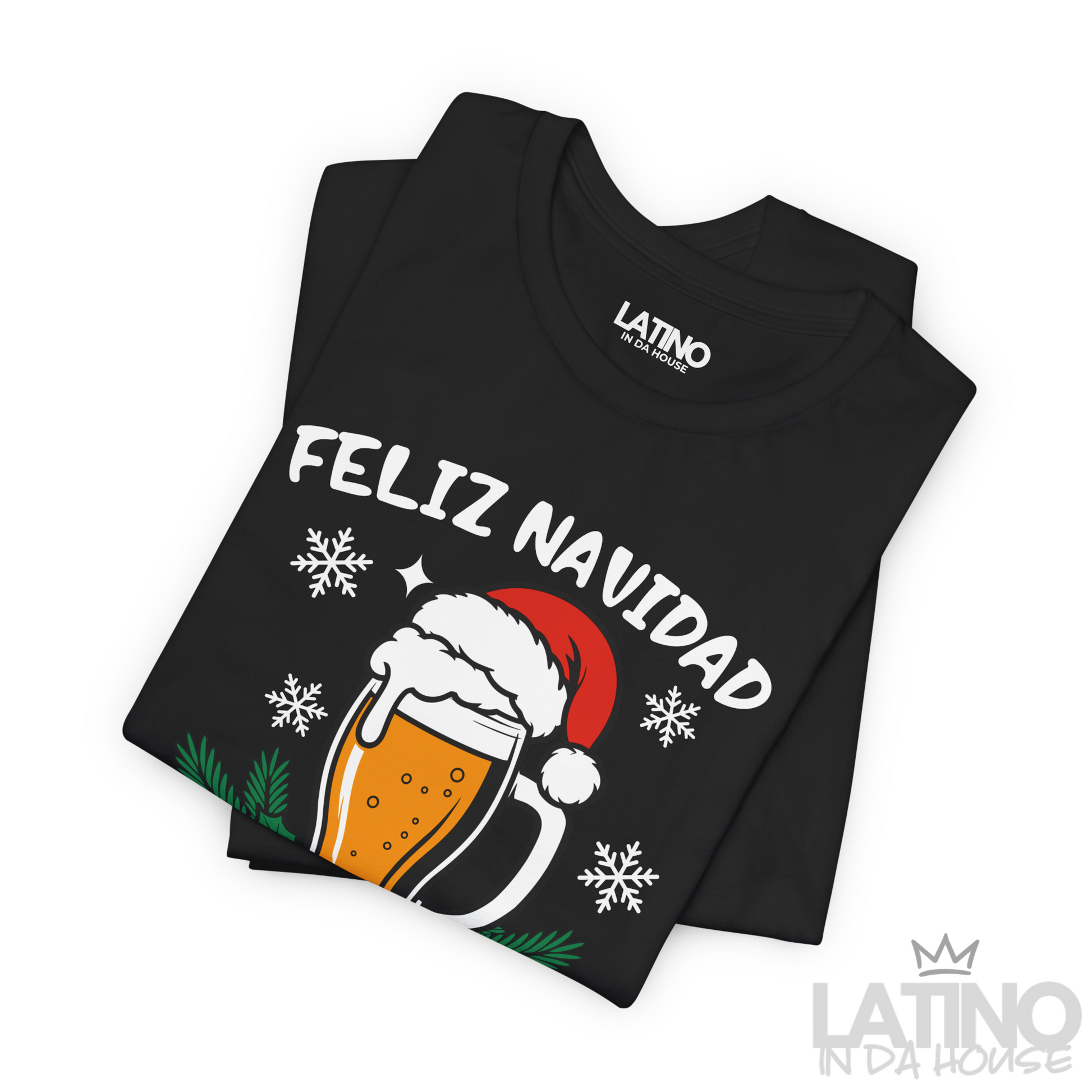 Bring the party vibes to every fiesta navideña. The Feliz Navidad Pero Primero Cerveza Tee mixes holiday cheer with a funny Spanglish twist that every Latino will relate to. Featuring a festive beer mug with a Santa hat, snowflakes, and holly accents, this tee is made for those who enter every gathering ready to say: “pero primero… una fría.”
