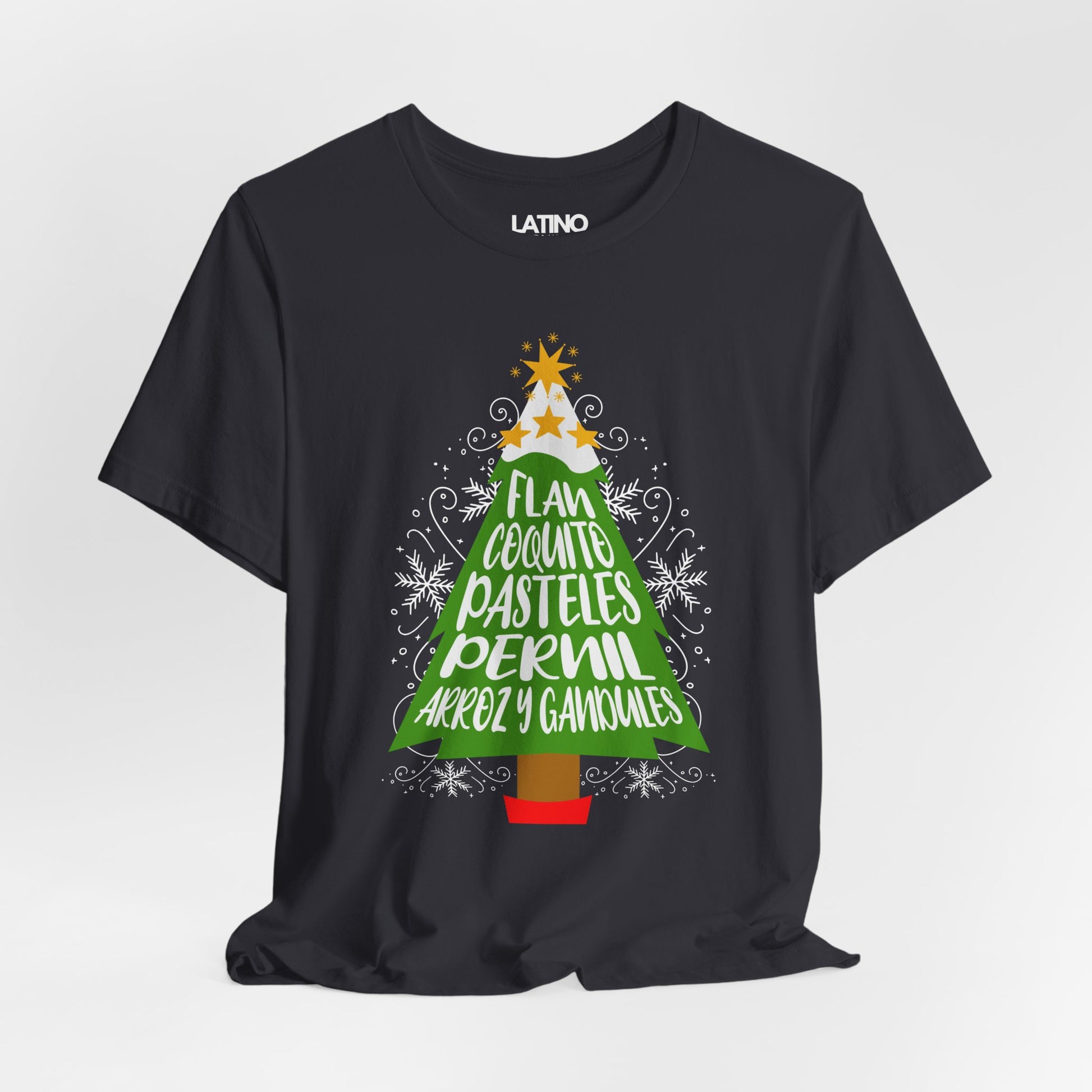 Bring the flavors of Puerto Rico to the holidays with the "Holiday Tree of Flavors" T-shirt! Featuring a festive Christmas tree design made of iconic Puerto Rican holiday dishes like flan, coquito, pasteles, pernil, and arroz con gandules, this shirt is a celebration of culture and delicious traditions. Made from 100% soft and breathable cotton, it’s perfect for holiday gatherings, family parties, or gifting to your favorite foodie.
