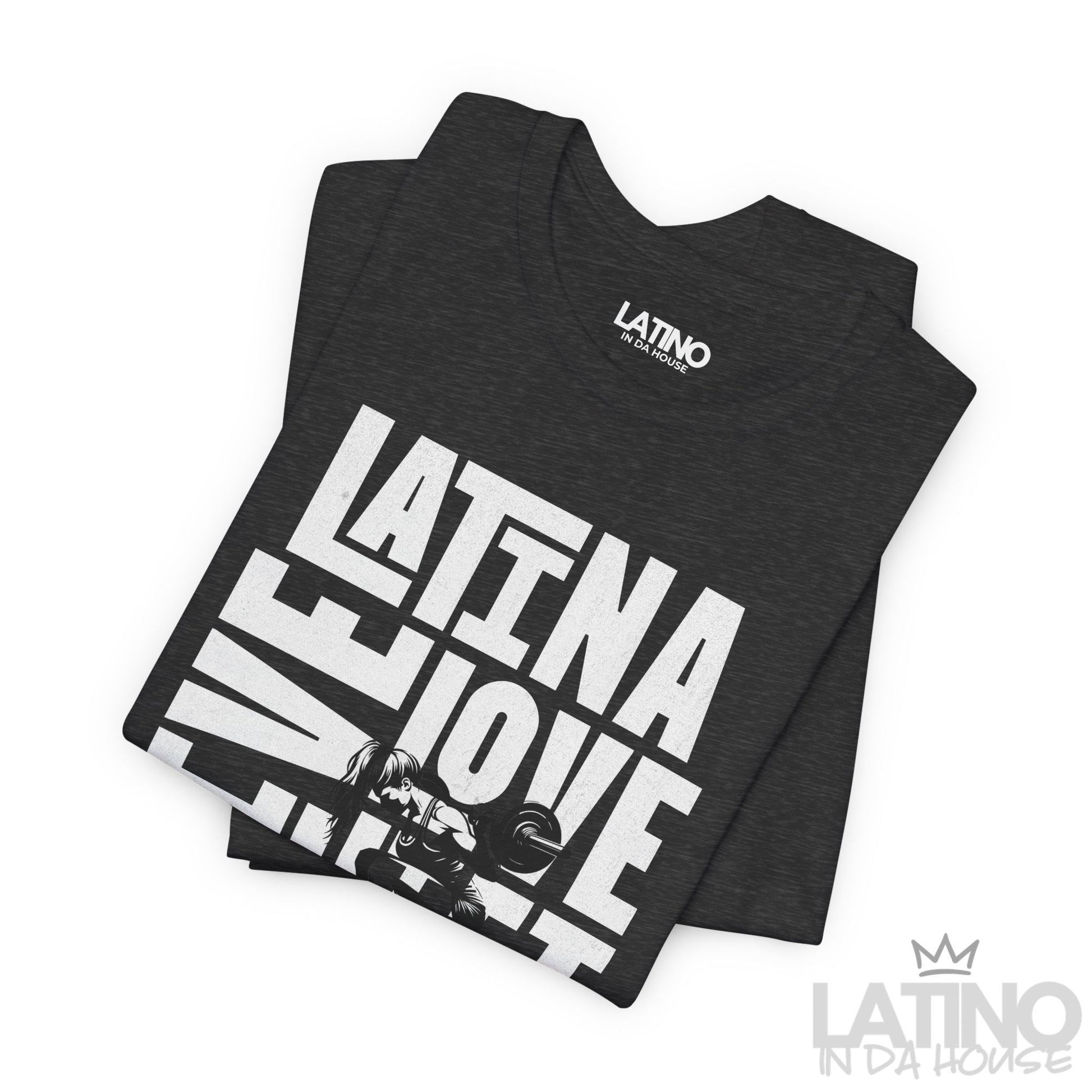 - Graphic: Latina Love Lift block design with barbell + mantra stripe.