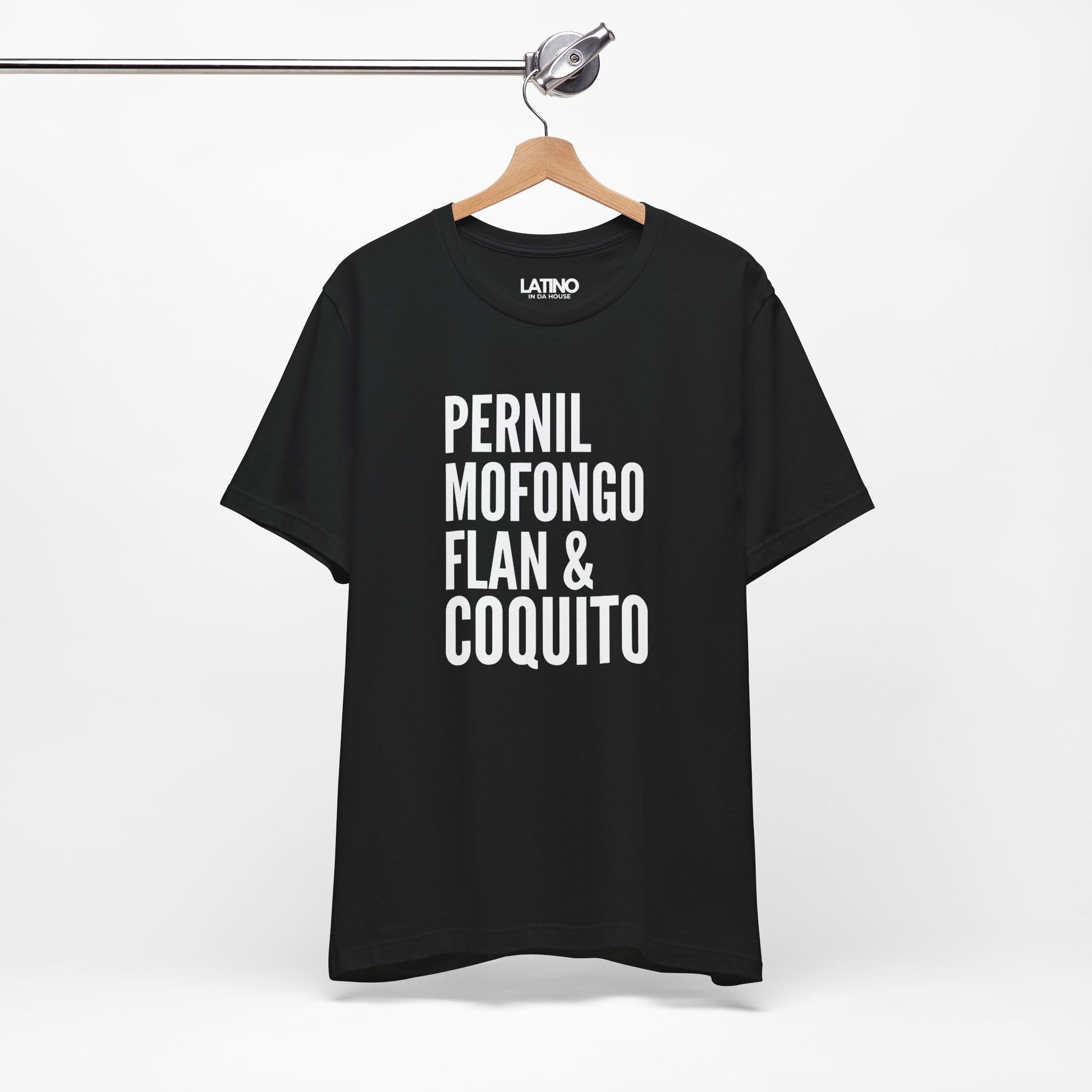 - Design: Crisp white t-shirt with the text "Pernil, Mofongo, Flan & Coquito" in a bold black font.