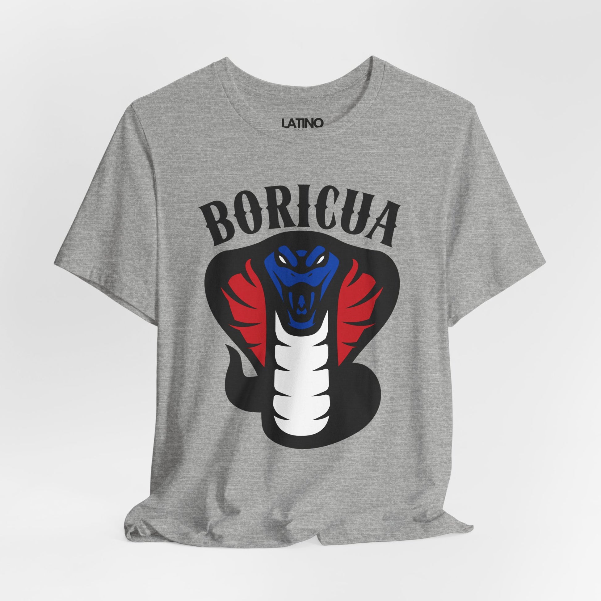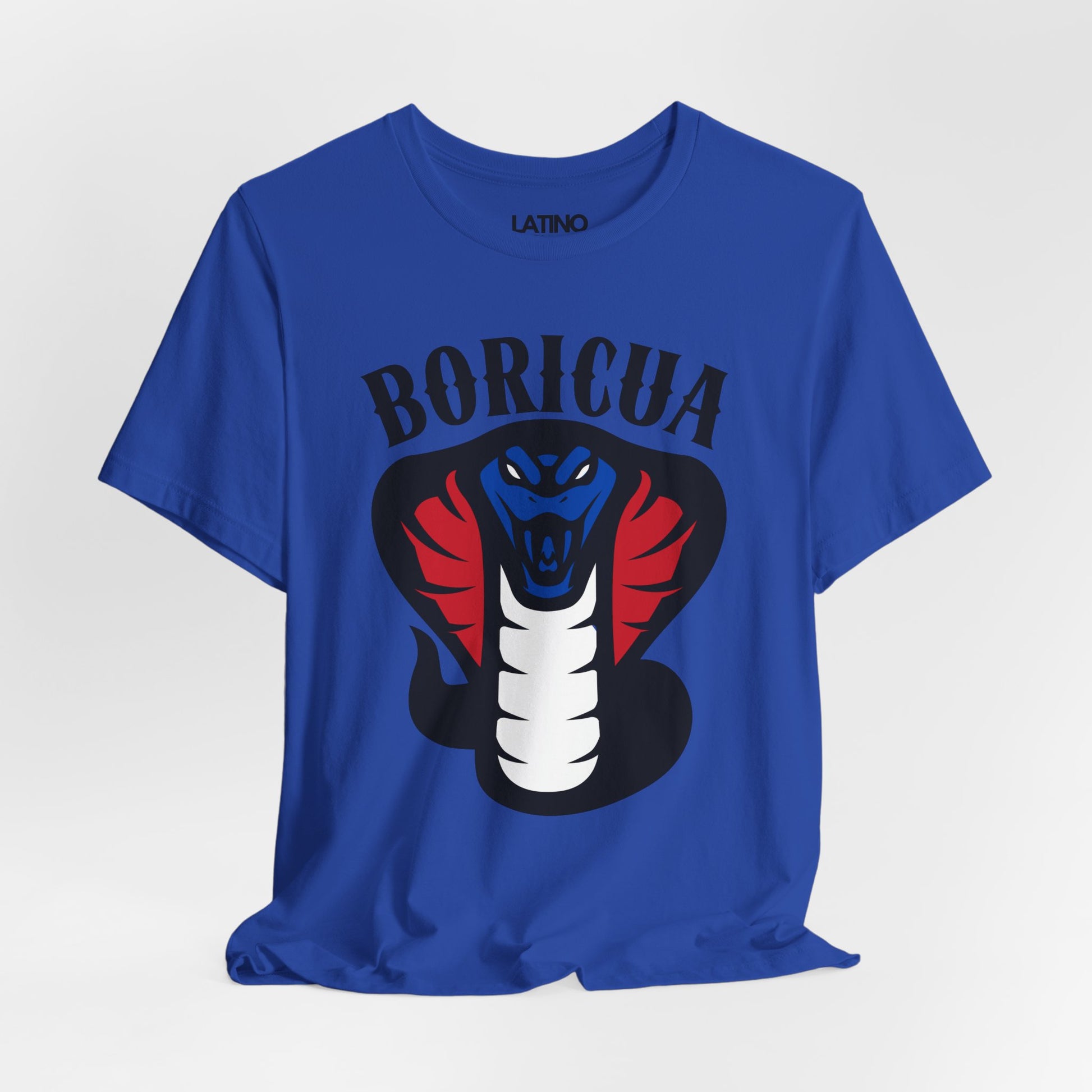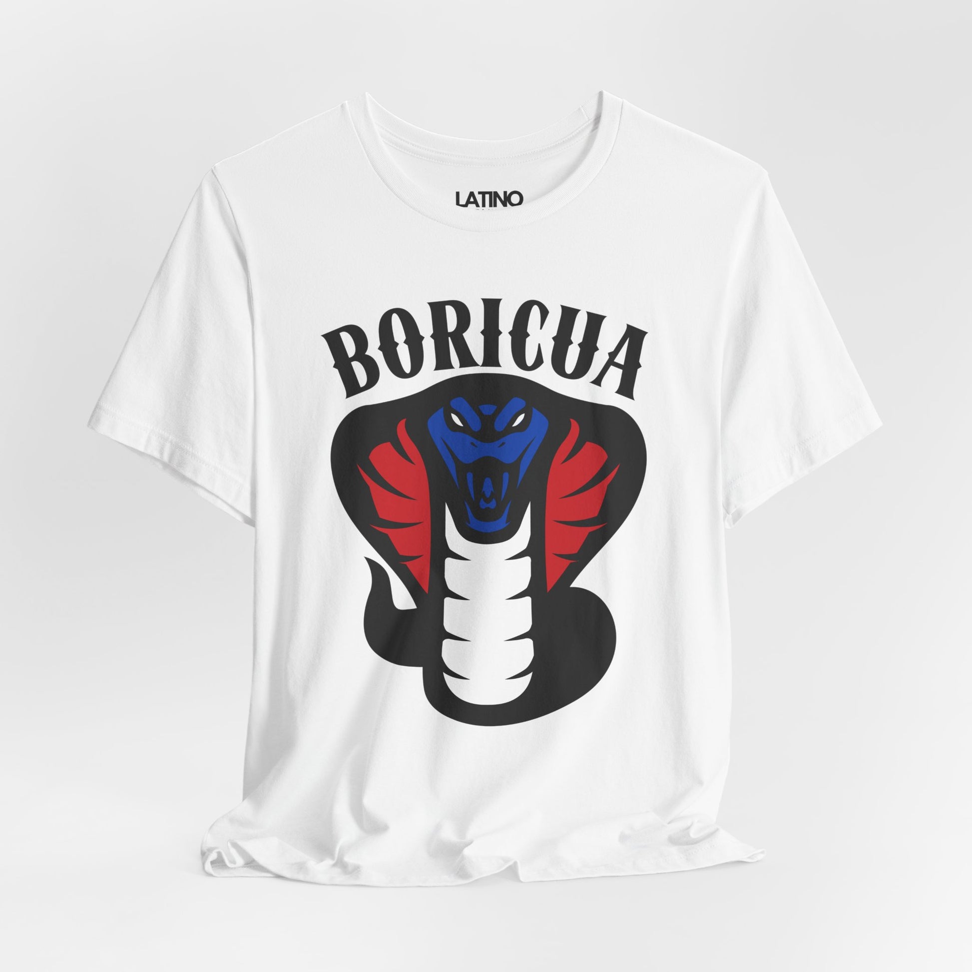 Show off your fierce pride with our Boricua Cobra T-Shirt! This striking design features a powerful cobra in red, white, and blue, symbolizing strength and heritage. The bold "BORICUA" text at the top makes a statement, honoring Puerto Rican culture and identity.