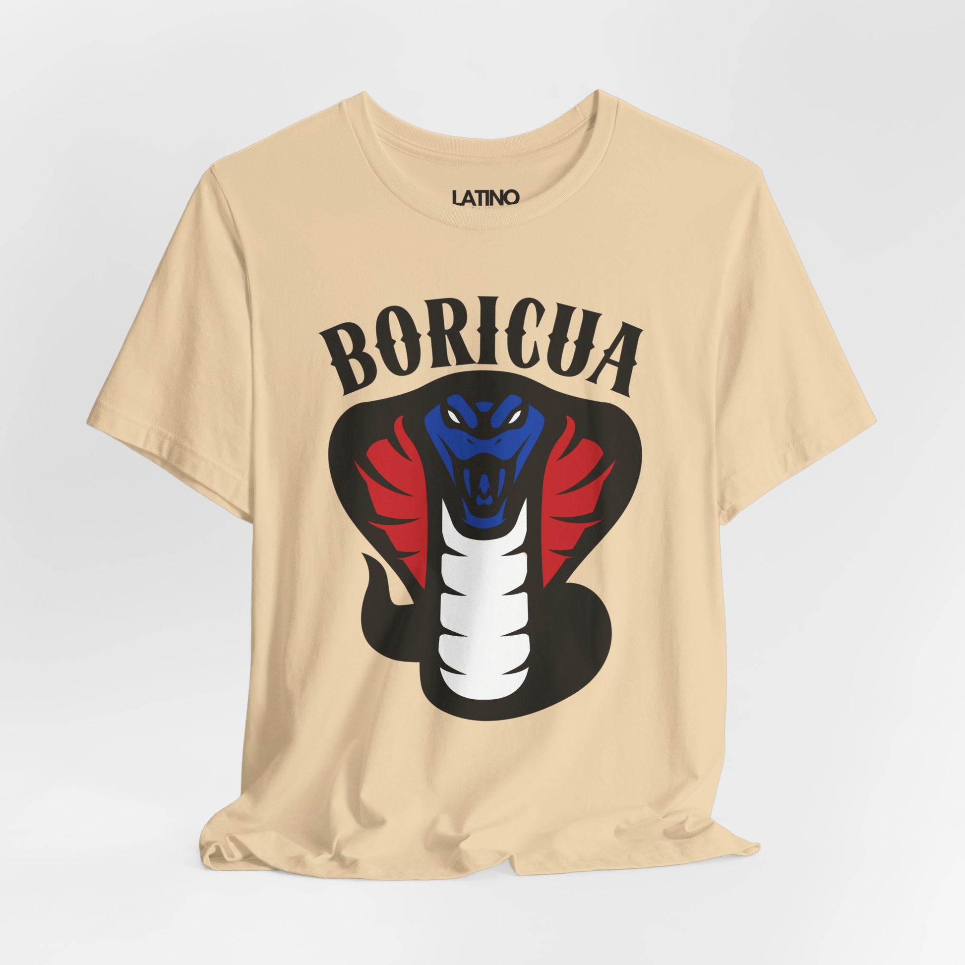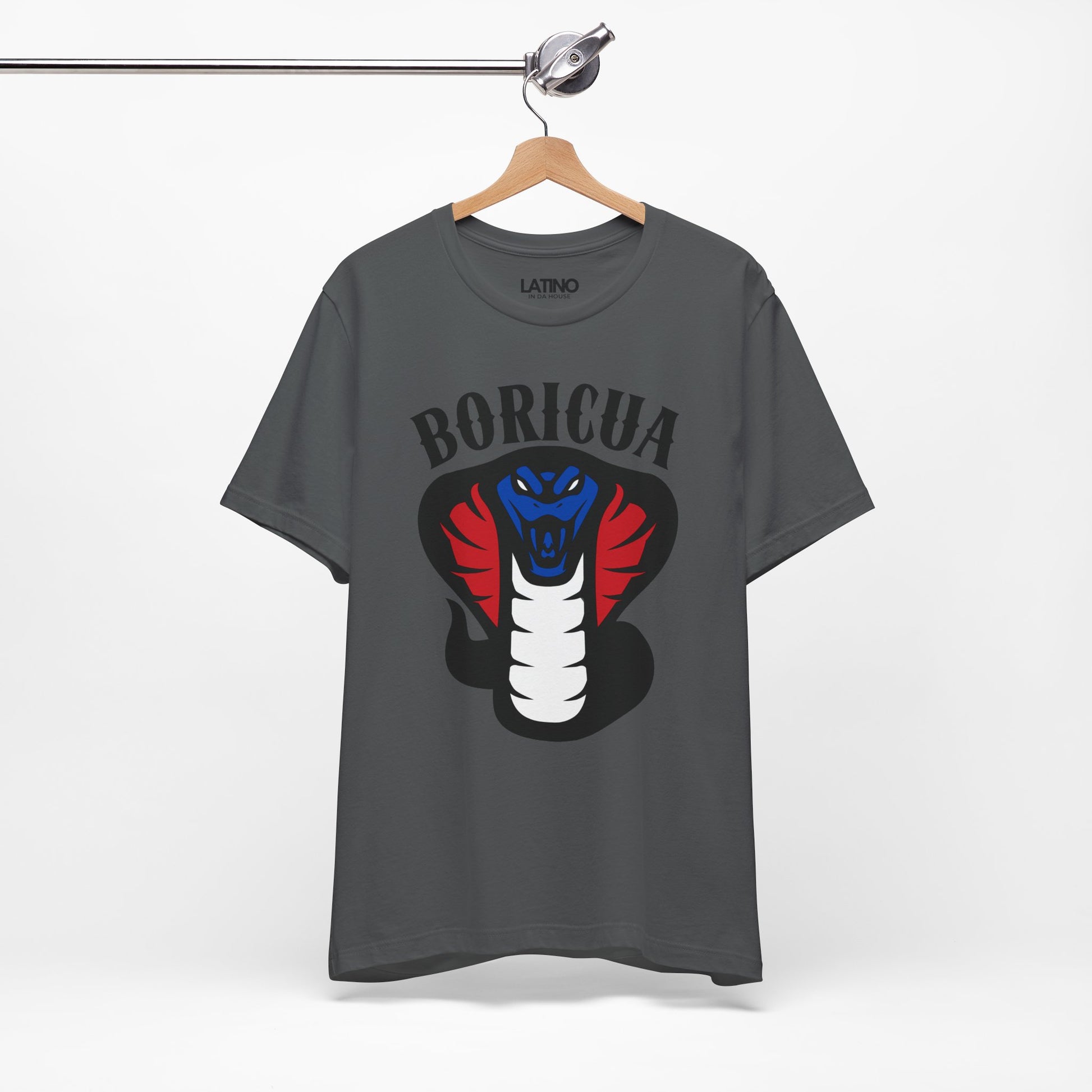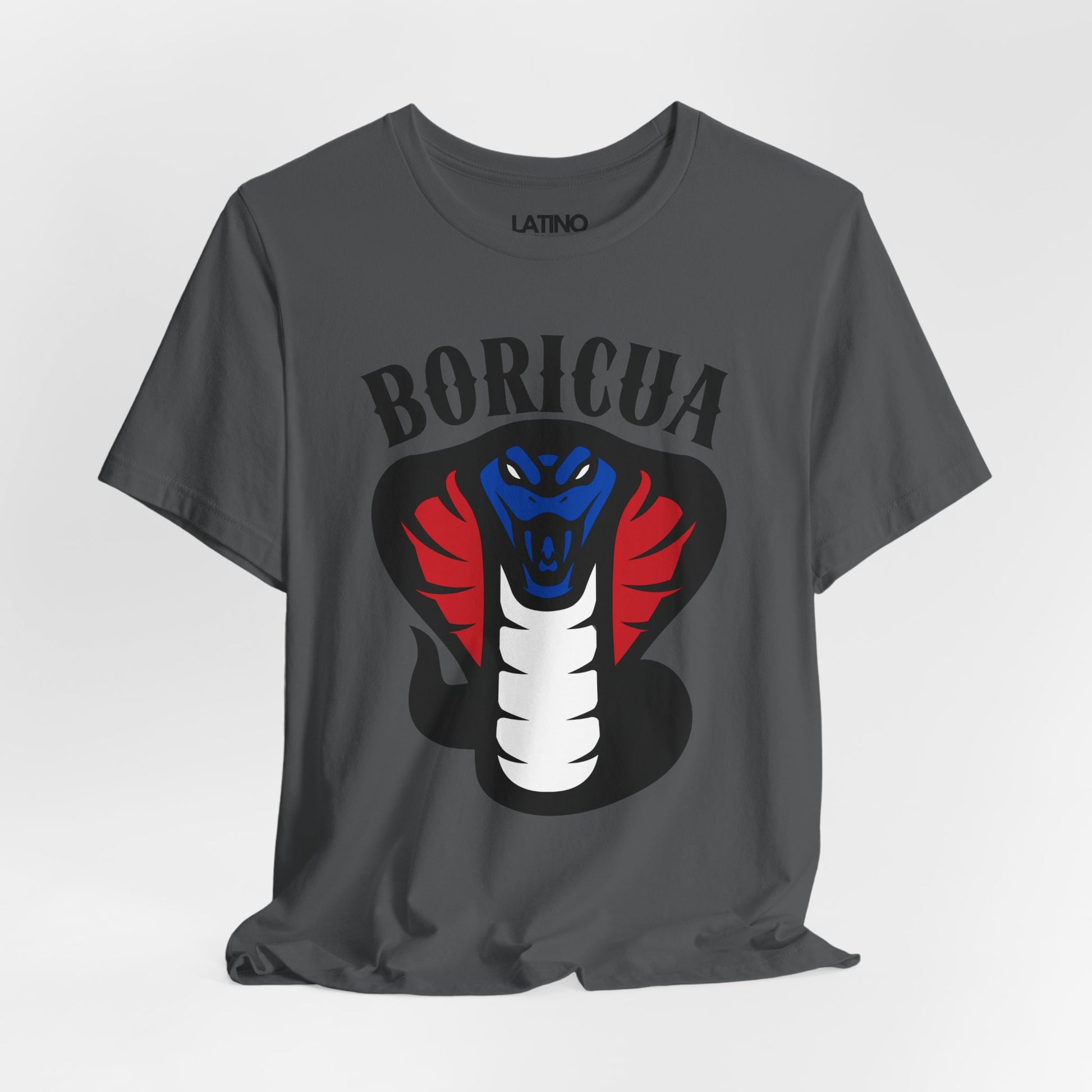 Show off your fierce pride with our Boricua Cobra T-Shirt! This striking design features a powerful cobra in red, white, and blue, symbolizing strength and heritage. The bold "BORICUA" text at the top makes a statement, honoring Puerto Rican culture and identity.